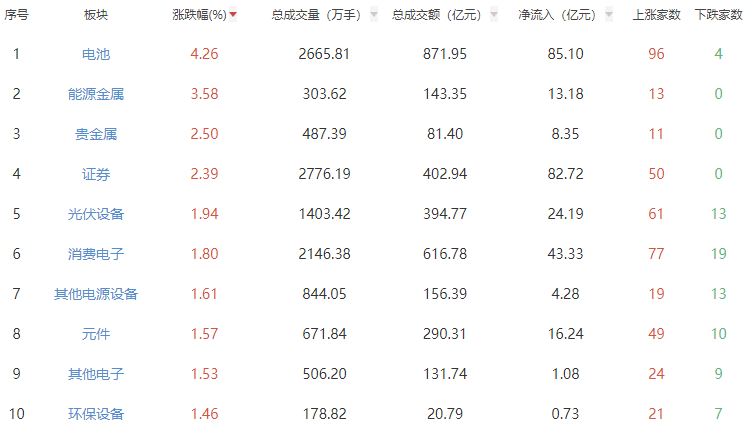 中国经济网络北京9月29日,A-A-Shares A-Shares今天早上增加了三个关键指标。在中午关闭时,上海化合物指数为3832.90点,增加了0.13%。深圳成分指数为13355.98点,增加了1.11%。 Chinext指数增加了1.77%至3207.44点。当涉及行业时,电池,能源金属和贵金属等部门获得最高的利润,而教育,黑色电器,煤矿和加工等部门则最低。 A-CARPART市场部门的上升和秋季分类