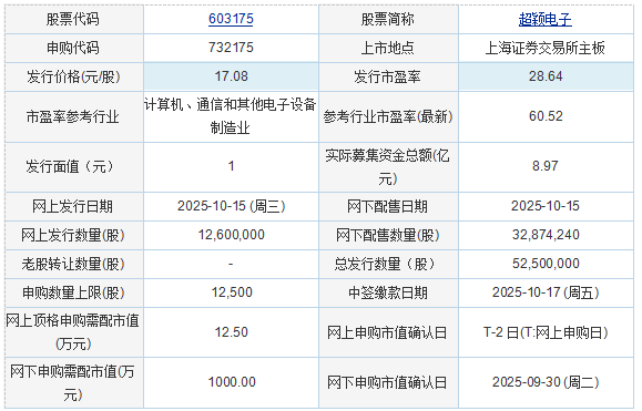 超盈电子电路股份有限公司 保荐人(主承销商):国联民生证券承销保荐人有限公司 发行状况: 公司简介:公司主营业务为印制电路板的研发、生产和销售。公司直接控股股东为动力控股,直接持有公司97.85%的股份。 Dynamic Holding是WINTEK (MAURITIUS)的全资子公司,而WINTEK (毛里求斯)又是Dynamic Electronics的全资子公司,而Dynamic Electronics又是Dynamic Investment Holdings的全资子公司。因此,Dynamic Investment Control 是公司的间接多数股东。第一大股东该公司的间接所有者是台湾上市公司Dynamic Investment Holdings。截至2025年3月24日,动力投资控股第一大股东为黄明洪先生。黄明洪及其联系人合计持有Dynamic Investment Holdings 9.02%的股份。 Dynamic Investment Holdings前10名股东合计持股比例为14.70%。股权比例多元化。没有股东拥有Dynamic Investment Holdings的实质性控股权益。因此,Dynamic Investment Holdings 没有实际管理人,公司也没有实际管理人。超盈电子2025年9月26日披露的IPO及主板上市招股书显示,公司拟募集资金6.6亿元,用于超盈电子旗下高多层及HDI投影有限公司二期工程,补充流动资金及偿还银行贷款。崔电子于2025年10月14日IPO主板挂牌,以每股发行价17.08元为基础,发行5250万股新股,若发行成功本次发行成功后,公司预计募资总额在扣除发行费用约人民币8.967亿元后。 93.5378 100万元(不含税),预计净利润80316.22万元。青岛大开英特种轮胎股份有限公司(北京证券交易所) 保荐机构(主要管理人):招商证券股份有限公司 刊发状态: 公司简介:公司以科技创新为驱动,聚焦全球工矿、建筑轮胎市场,专业从事工矿、建筑用轮胎的设计、研发、销售和服务。截至招股说明书签署日,泰凯英控股直接持有公司股份129,106,698股,占公司总股本的72.94%,为公司第一大股东。王传珠通过泰开英控股间接控制公司72.94%的股份。王传珠配偶郭永芳直接持有公司股份11,986,091股公司,占公司总股本的6.77%。王传柱先生、郭永芳先生合计持有公司79.71%的股份,为公司实际控制人。据泰凯英2025年10月13日发布的招股书显示,公司计划募集资金3901.032亿元,用于全场景专项项目。轮胎产品改进项目、特种轮胎创新技术研发中心建设项目、特种轮胎智能管理系统完善项目。根据泰凯英2025年10月13日发布的《关于向不特定合格投资者公开发行股票并在北京证券交易所上市的公告》,若发行成功,公司预计募集资金总额为33,187.5万元。预计扣除发行费用4143.55万元(不含增值税)后净利润为29043.95万元。