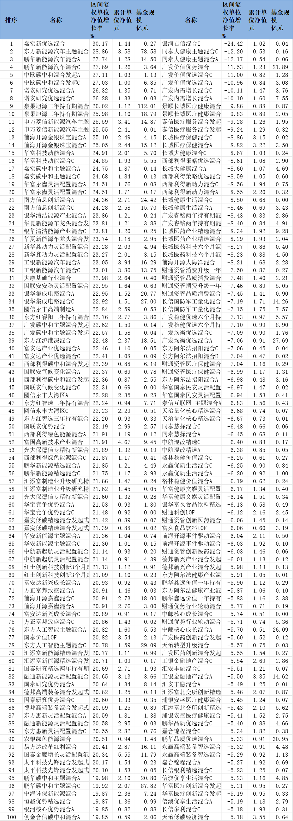 中国经济网北京10月10日电(记者何晓)今年9月,市场表现可比的8627只混合型基金(各类股票单独计算,下同)中,7058只基金资产净值增加,占比81.81%。 1,549只基金净值下跌,其余20只基金净值持平。嘉实新精选混合动力、东方新能源汽车主题混合动力、鹏华新能源汽车混合动力A、鹏华新能源汽车混合动力C、中欧碳中和混合起源A、中欧碳中和混合起源C等14只混合型基金9月份涨幅超过25%(含25%),收益率30.17%,领涨。分别为28.86%、27.74%、27.69%、27.11%、27.03%。竹哈rvest New Preferred Mix,增长率最高。该基金成立于2016年4月8日,截至2025年9月30日,本年收益率为54.33%,成立以来收益率为46.56%,累计资产净值1.4440元。据半年报显示,今年上半年,嘉实新优混合动力大幅增加了锂电池设备配置。截至今年6月30日,公司持股前10名分别为宁德时代、星宇科技、普提莱、先锋智能、长景锂能、美亚光电、豪威科技、兆易创新、胜邦科技和天奈科技。嘉实新精选组合现任基金经理为熊宇洲。熊宇舟于2015年7月被任命为嘉实基金负责人,加入管理有限公司研究部,参与行业研究。 2021年8月26日,担任嘉实新优先灵活配置混合型证券投资基金经理基金。据悉,月度增速超过25%的14只混合型基金(含25%)中,截至今年上半年规模超过10亿元的基金包括东方新能源汽车主题组合、鹏华新能源汽车组合A、国旭源3年持有期Mix A、国旭源3年持有期Mix C和申万灵新能源汽车主题等。灵活配置混合A和前海开元金银珠宝混合C。以金额最大的郭修元3年持有期混合A为例,该基金月增长率为26.02%。其成立于2022年10月18日,截至今年6月30日规模为1120万元。截至2025年9月30日,本年收益率为48.80%,成立以来收益率为11.72%,累计净额为1.1172元。今年上半年,全国旭源三年Mix A组合持仓主要集中在涉足香港上市互联网企业,以及电力设备及新能源、计算机、电子、机械、军工等高端制造业。截至今年6月30日,公司持股前10名分别为科达利、CATL、腾讯控股、美团、恩杰、新全、英流、立讯精密、快手、真信科技。全国旭源的持有期限为3年。 Mixed A现任基金经理为赵毅。赵毅曾任新银万国证券研究分析师,并曾在农银CA基金管理有限公司担任职务,包括中小股研究员、机械研究员、研究员、助理基金经理、基金经理、投资部副经理(主持工作)、投资部总经理。目前在全国基金管理有限公司公募投资部担任基金经理。同时,共有8只混合型基金跌幅超过9 月份为 10%。其中五家为广发基金所有。分别为广发价值优势组合、广发价值优先组合C、广发价值优先组合A、广发内需扩张组合C、广发内需扩张组合A。降幅分别为11.53%、11.00%、10.96%、10.11%和10.10%。 2025 年 9 月前 100 名混合基金数据来源:Flash(扩容截止日期:2025 年 6 月 30 日)
